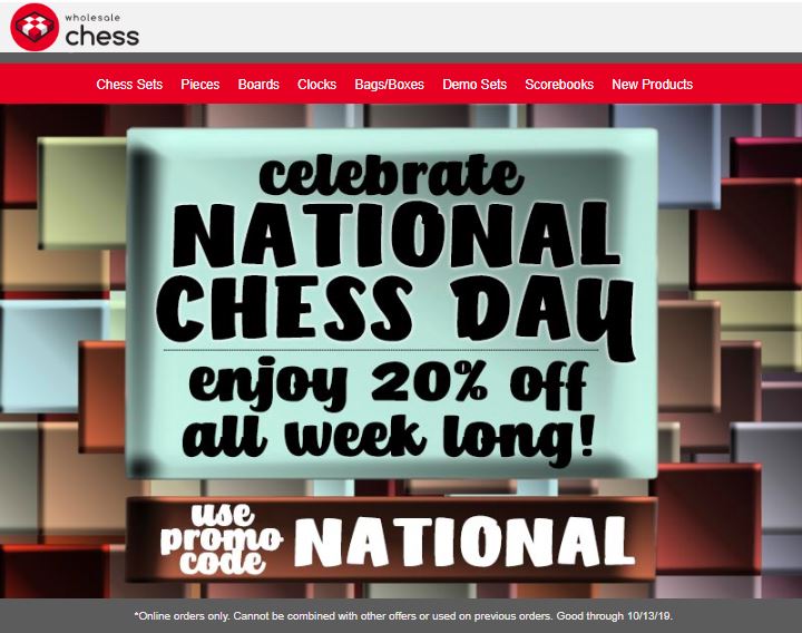 WholesaleChess.com has made the Indermaur Chess Foundation an Affiliate and is having a 20% off promotion through October 13, 2019 to celebrate National Chess Day.