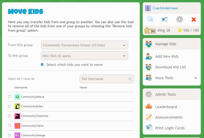 3) Move them to our “Misc Kids” group or to an “Alumni” group for your school: Their account would remain active and parents could still manage the accounts. With this option, the students would not be in your current club but could continue to play in our online tournaments. Please let us know if you need help creating an “Alumni” subgroup or if you would like to move kids to our “Misc Kids” group. To move kids between groups, click on “Groups” and the “More Tools” drop-down menu on the right. Then click on “Move Kids”, select the “From” and “To” groups and click the “Select which kids you want to move” box to move specific students.