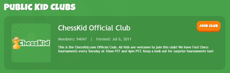 ChessKid is also running Fast Chess tournaments twice a day. Any child can participate by joining the ChessKid Official Club. To join, click on “Clubs” and then “Public Clubs”. If the ChessKid Official Club is not yet listed under your “My Clubs” list, find it under “Public Clubs” and click its orange “Join Club” button. Please note that only children can join this club, so adults will not see this club on their clubs lists.
