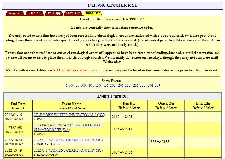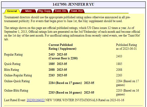 Then click on your line in the results list to display your USCF summary page. Clicking on the Jennifer Yu from Virginia will display this page: